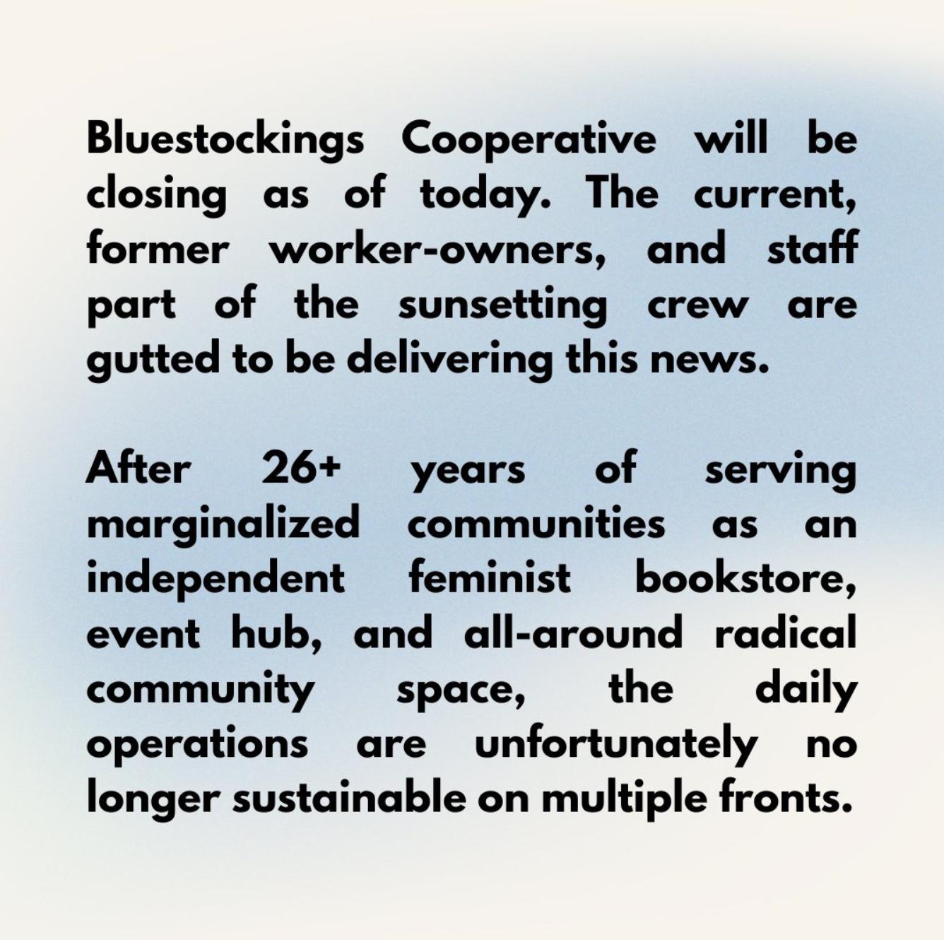 arrow-up11arrow-down1imageBluestockings, the radical feminist bookstore, announced it's closing downplus-squarei.redd.itLemmit.Online botMABEnglish · 13 days agomessage-square0linkfedilink