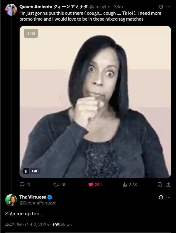 arrow-up11arrow-down1external-linkQueen Aminta on Twitter, "I’m just gonna put this out there ( cough… cough …. Tk lol ): I need more promo time and I would love to be in these mixed tag matches". Deonna Purazzo responds, "Sign me...plus-squareimgur.comLemmit.Online botMABEnglish · 11 hours agomessage-square0linkfedilink